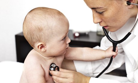 A physician employs a stethoscope on a baby. Photograph: Getty Photos/Vetta